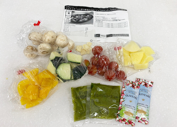 今回試してみたのはホットクックで作る「マッシュルームと彩り野菜のアヒージョ」。冷蔵便で届きました。メニューによって異なりますが、今回のキットの野菜はすべてカット済です。レシピカードと一緒に、材料ごとに袋に入った状態で届きました。
