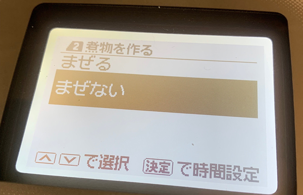 内鍋を本体にセットしました。レシピカードに書いてある通り、手動コースの「煮物を作る・混ぜない」を選び、時間を10分にして調理スタート。沸騰してから10分なので、合計時間は25分ほどでした。