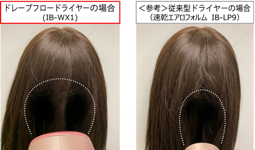 (1) 2つの吹き出し口からの風が、髪をドレープ状に押し分け、広範囲に風を届ける新速乾方式により、乾燥時間を当社従来機比約25%短縮