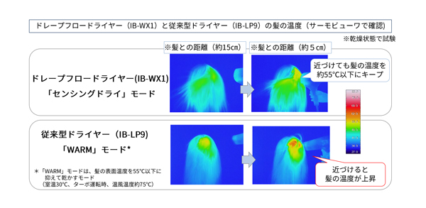 次に(2)の「センシング機能」について。ドライヤーと髪の距離にあわせて温度を自動コントロールする「センシング機能」を搭載し、髪の温度を55℃以下(目安)にキープします。熱い風が苦手な方や、熱によるダメージが気になる方におすすめです。