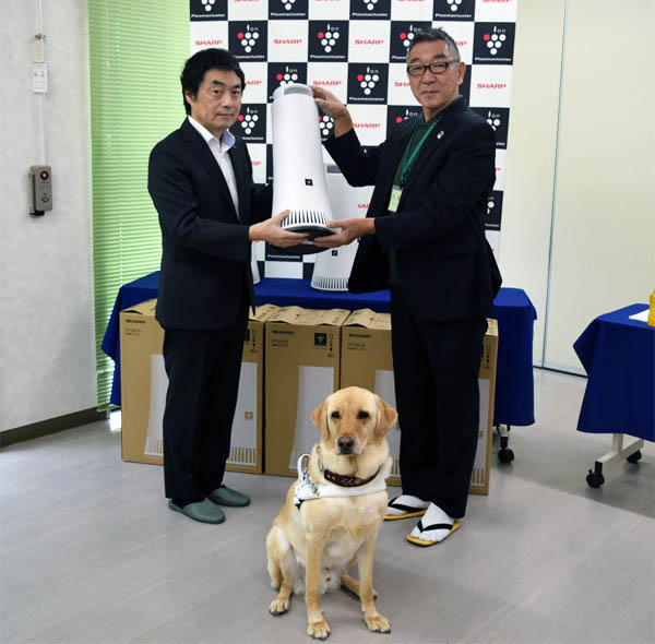 また、今回、商品開発にモニターとしてご協力頂いたことから、本機を5台寄贈しました。9月に開催された寄贈式で、シャープ Smart Appliances & Solutions事業本部 国内空調・PCI事業部 PCI商品企画部長の植田宜裕(以降、植田さん)から、社会福祉法人日本ライトハウス 盲導犬訓練所 所長の田原恒二様(以降、田原様)に寄贈し、訓練所施設内の空気の質の改善に活用いただいています。