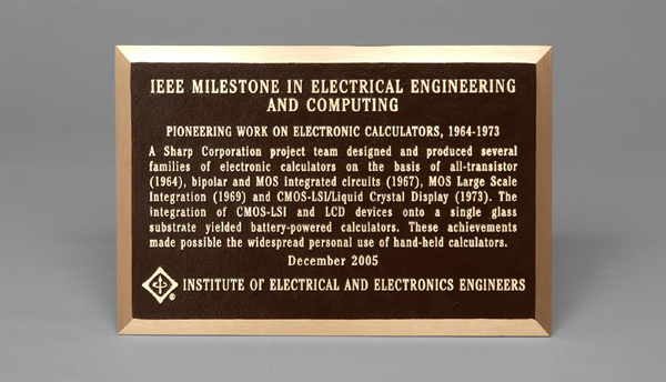 その後、電卓事業は多くの企業が参入するとともに、ICの採用による小型化が進むなど、大きく発展していきます。初出荷から41年がたった2005年、当社の電卓事業は「電子式卓上計算機の先駆的事業」として、米国電気電子学会(IEEE)の選定する「IEEEマイルストーン」に認定されました。