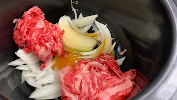 まずは牛どんです。この自動メニューでは、内鍋で牛どんの具を調理し、蒸しトレイで冷凍ごはんを温めます。牛肉、玉ねぎといった具と調味料を内鍋にセットし、蒸しトレイにラップをはずした冷凍ごはんをのせて、自動メニュー「どんぶりの具&冷凍ごはん(牛どん)」を選びます。