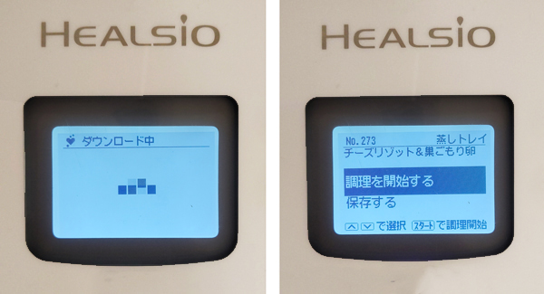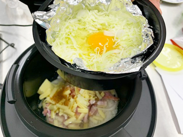ダウンロードが終わったところで、調理開始です。内鍋にお米と具材、調味料を入れます。蒸しトレイにはアルミホイルで作った型に千切りキャベツと卵を入れてセットします。あとは「調理を開始する」を選ぶだけ。