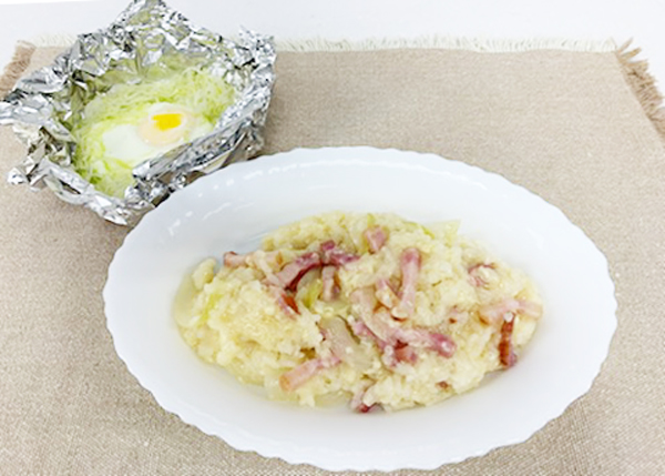程よくお米の芯が残ったおいしいリゾットと巣ごもり卵の完成です!一度にメインのお料理とおかずができました。