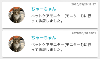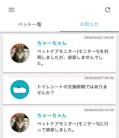 猫がトイレに入ると、こんなふうにアプリからお知らせがあります。