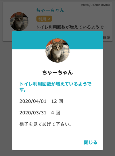 トイレの回数に増減があれば、こんなメッセージも届きます。