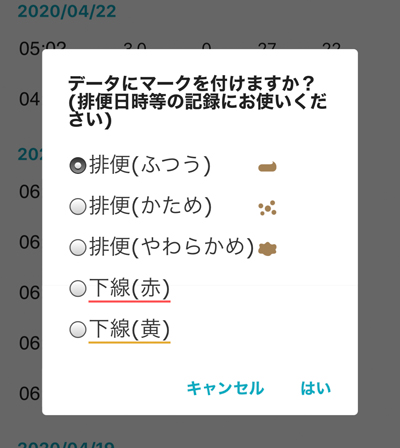 日々の数値はこんなふうに記録されます。「時間」はトイレの滞在時間、「温度」はトイレ付近の室温です。