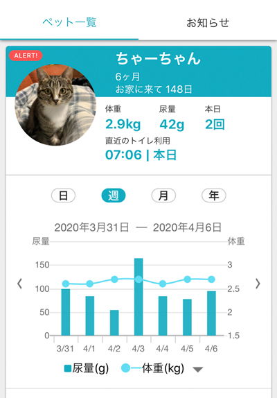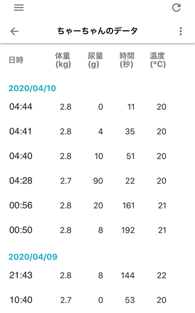 これまでなんとなくおしっこの様子は見ていましたが、正確な回数や量まではわからず、こうやって数値ではっきりとわかるのはとても安心だと思いました。また、病院にかかるとき、おしっこの状況をすぐに伝えることができるのは心強いです。