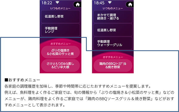 AIoTクラウドサービス「COCORO KITCHEN」により、使うほどに表示内容が進化する「AIパネル」を新搭載。各家庭の調理履歴などをクラウドで学習し、季節や時間帯によって、そのご家庭にあわせた「いつものメニュー」と「おすすめメニュー」を表示します。