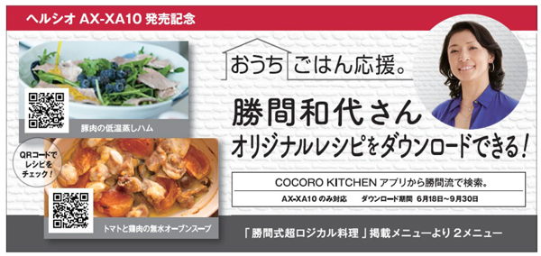 ヘルシオのヘビーユーザーであり、当社のイベントにも登場くださっている経済評論家の勝間和代さん。今回、<AX-XA10>をお買い上げの方を対象に、期間限定で勝間さんのオリジナルレシピをヘルシオにダウンロードできるキャンペーンを実施いたします。