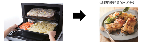 これのどこがすごいかというと、例えば冷凍庫から出したばかりのお肉を上段に、下段には好みの野菜を並べて、調理スタート!これだけでメインディッシュとつけあわせが出来上がります。大きいお子様がいるご家庭でも大満足のボリュームの料理が、手間をかけずにほったらかしでできるので、おいしいお料理を家族で囲み、リフレッシュできますね。