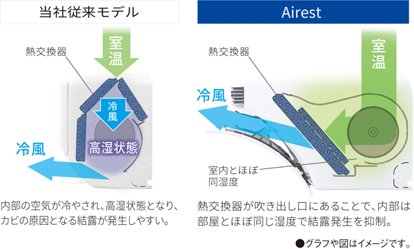 冷房運転時は、吸い込まれた室温の空気が、冷たい熱交換器を通ることで温度が下がり、冷風が出ていく仕組みになっています。従来モデルでは、空気をエアコン内部で冷却するためカビの原因となる結露が発生しやすくなっていました。一方、「Airest」では吹き出し口近くで冷却するため、エアコン内部は室内とほぼ同じ湿度が保たれ、結露が発生しにくくなっています※4。