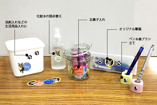 次に、無地の容器や筆箱などにシールを貼ってみました。オリジナルデザインの画像をシール紙へプリントすることで、身の回りを自分好みの雰囲気に統一することができました。