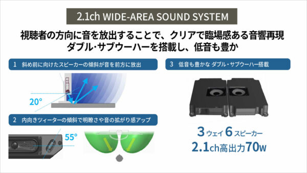 はい。CX1シリーズは、2.1ch「WIDE-AREA SOUND SYSTEM」を搭載しています。まず、スピーカー振動版を、一般的なレイアウトとは異なり、20度斜め前に向けて配置しました。こうすることで、放出した音がテレビボードで反射して、前方にいる視聴者の耳元までリフトアップされて届きます。次に、指向性の強い高音域のツィーターの向きを、視聴者を左右から包み込むように55度内向きに傾斜させました。これにより、音の明瞭さや拡がり感がアップします。さらに、豊かな低音を再生するダブル・サブウーハーを搭載し、3ウェイ6スピーカー(高出力70W)で、クリアで立体的な音響を楽しめるようになりました。