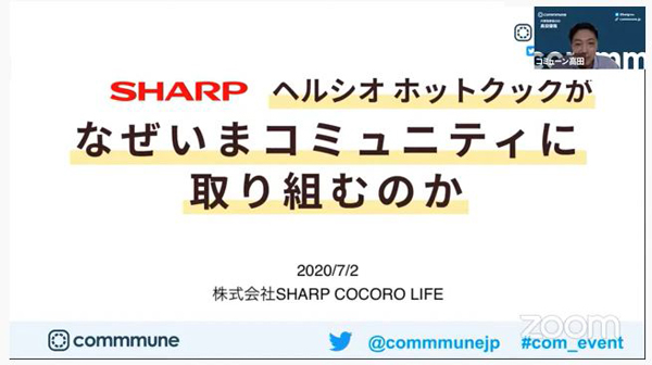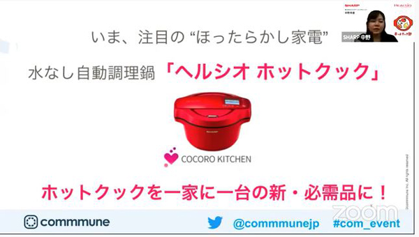 「ホットクック部」は、コミューン株式会社提供のコミュニティマーケティングツール「commmune(コミューン)」を利用しています。先日『ヘルシオホットクックがコミュニティに取り組む理由』と題し、コミューン株式会社によるオンラインイベントが開催され、企業コミュニティにご興味のある方を中心に、さまざまな方が参加されました。コミューン株式会社代表取締役CEOの高田様、「ホットクック部」の企画・運営にかかわる 株式会社 SHARP COCORO LIFE の中野によるトークセッションの内容を少しご紹介します。