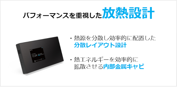 (川崎・空閑)モバイルルーターにとって、「安定した通信速度を継続して出せること」が最も重要であり、熱による処理速度の低下をできる限り起こさないように、放熱設計に一番こだわりしました。熱源を分散したレイアウトと放熱を効率的に行うため内部金属部品の配置について試行錯誤を繰り返し、最適な放熱設計を実現しました。
