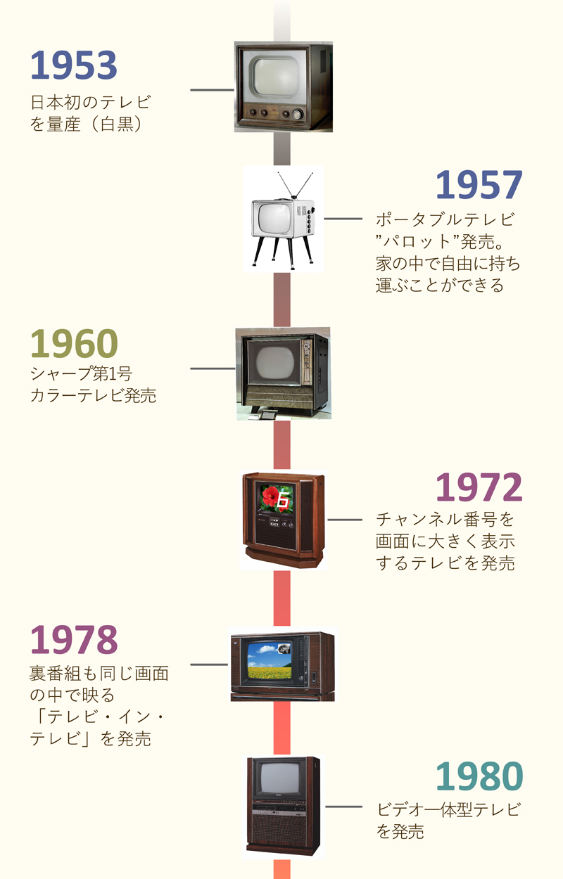それではシャープのカラーテレビ、60年間の変遷と、その前に白黒テレビについても簡単にご紹介しましょう。