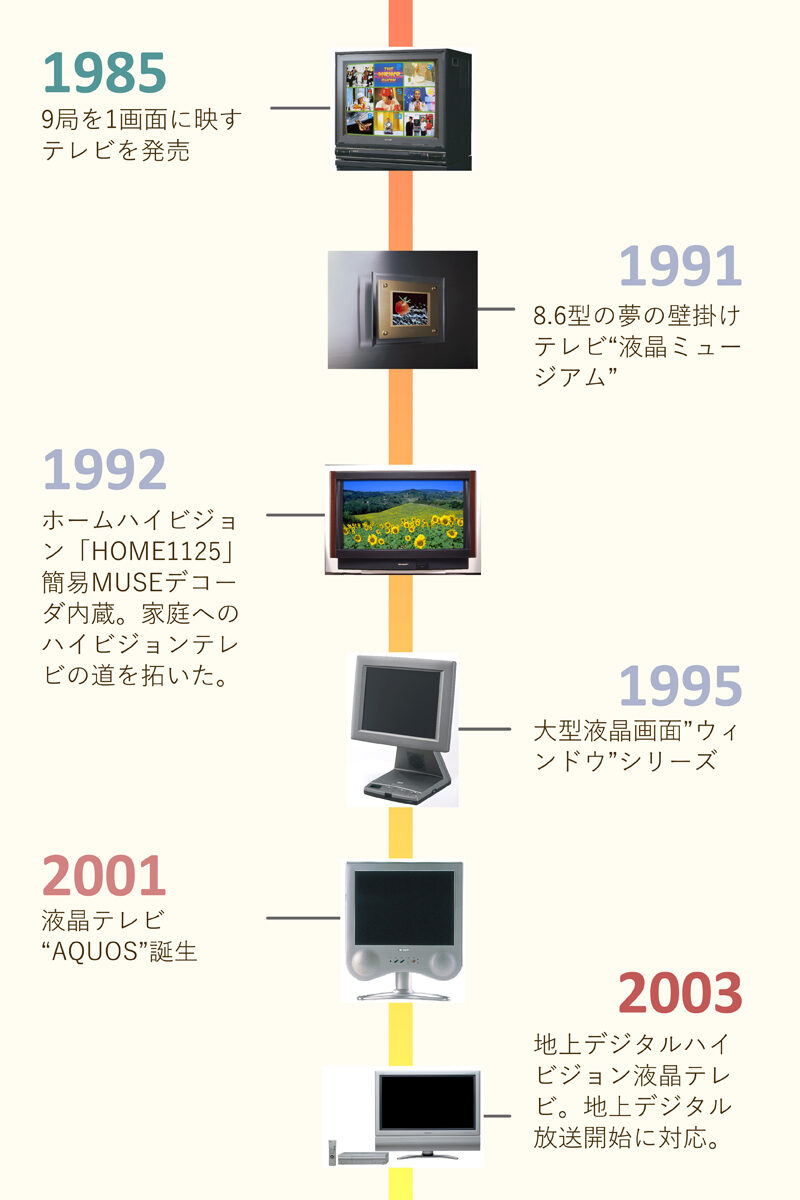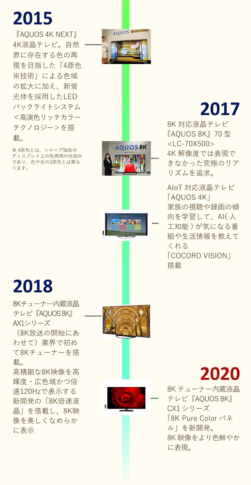 当社は長い歴史の中でさまざまなテレビを開発してきました。そしてこれからの時代は超高精細映像技術である8Kと、高速・大容量の通信技術である5Gを組み合わせることで、まったく新しい生活を提案していきたいと考えています。