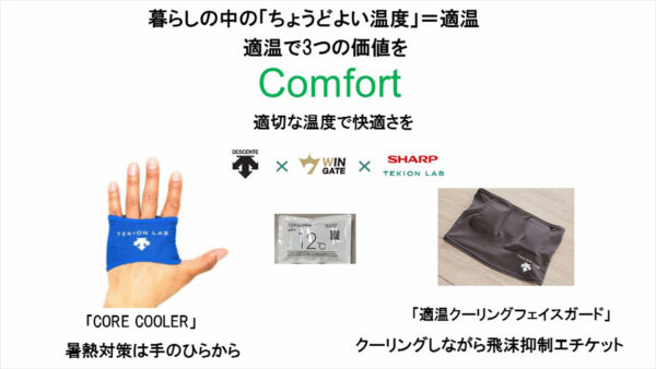 ※2 2017年3月に研究開発事業本部内に発足した、当社初の社内ベンチャー組織。水をベースとする独自の「蓄熱技術」をもとに、「適温蓄冷材」による応用商品を製作しています。シャープブランドとして、2019年9月に氷点下2℃のおいしい新感覚飲料を楽しめるクーラーバッグ「TEKION COOLER(テキオン クーラー)」を発売しました。また、発足以来、数々の協業を進め、今年(2020年)は、グローブ型クーリング(暑熱対策)アイテム「CORE COOLER」や、冷却効果のある飛沫エチケット製品「適温クーリングフェイスガード」をデサントジャパン株式会社・ウィンゲート株式会社・当社の3社で共同開発しました。