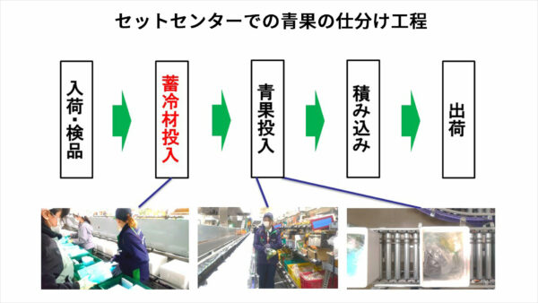 このような背景から、パルシステムさまは、セットセンターでの青果の仕分けを行う通常勤務時間の朝9時頃ごろから夕方の間に、最長33時間融けずにもつ12℃の蓄冷材を投入することができれば、人手の問題と0℃蓄冷材増量に伴う電力消費量増大の問題の両方を解決できると考えておられました。