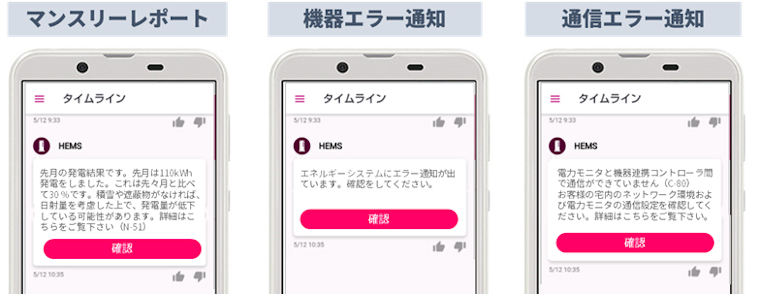 「モニタリング基本機能」は、太陽光発電システムの発電レポートを毎月1回お届けするほか、万が一のシステムの動作不良や通信エラーを検知すると速やかに通知します。