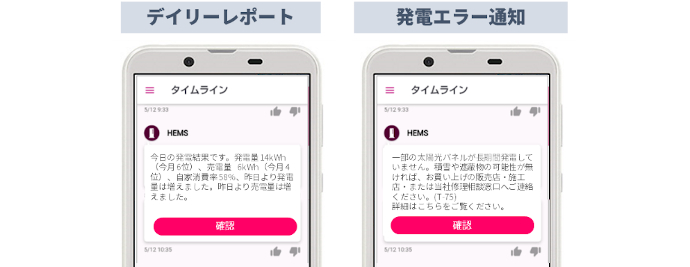 「モニタリング発電診断」は、発電量や売電量を毎日お知らせし、発電量の低下が一定期間続いた場合にも通知します。