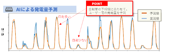 太陽光発電の発電量のAIによる予測値(オレンジ色)と実測値(青色)