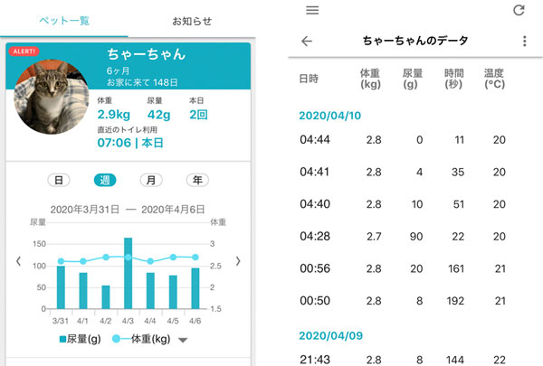 一般的なシステムトイレと違うのは、トイレ本体の下に設置したセンサーにより、猫ちゃんのおしっこの量やトイレに入った回数、体重などが計測できるところです。それらのデータは、専用のアプリで管理することができるので、いつでもスマホで確認できます。家族でデータを共有することも可能なんです。