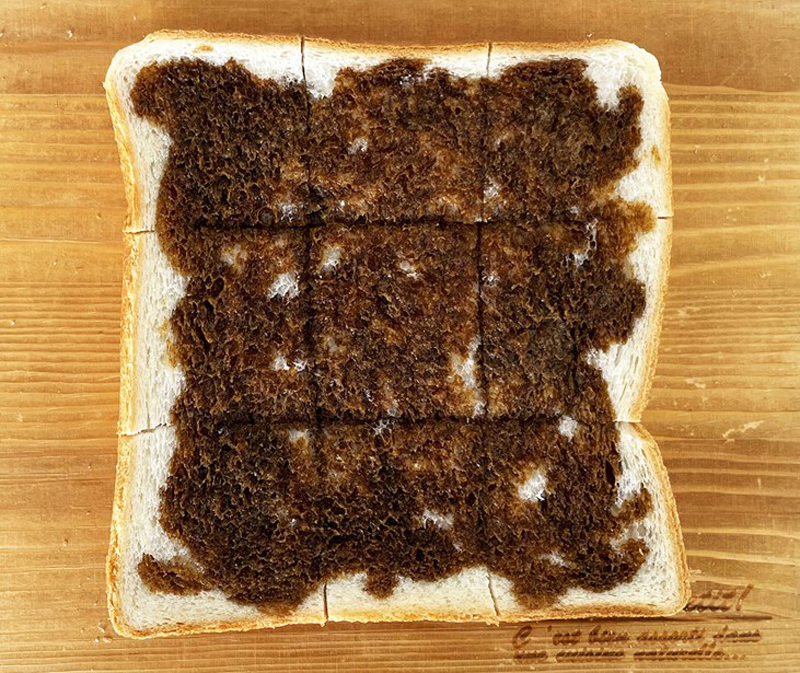 ② お湯で溶いたインスタントコーヒーを食パンに染み込ます