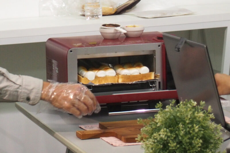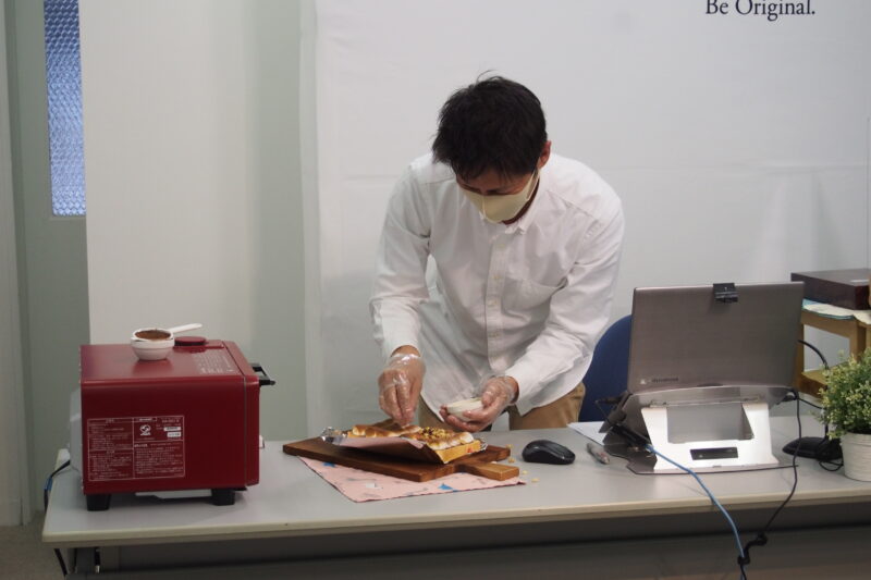 最後に食パンのアレンジレシピをご紹介いただき、その場で作り、MCを務めた佐々木さんが実食しました!当日、広報担当Uはその様子を撮影していたのですが、甘い香りが部屋中に広がって本当に美味しそうでした!(あとで広報担当Uも試食させていただきました。とても美味しいオリジナルアレンジパンでした)