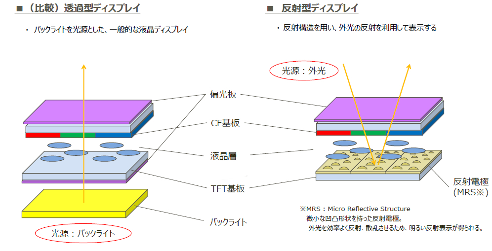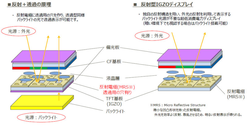 下図の左のように、反射電極(MRS)にバックライト透過用の穴がある構造で、外光が十分にあるときは外光の反射を光源として利用し、外光が少ないときにはバックライトを光源として利用することができる「良いとこ取り構造」になっています。