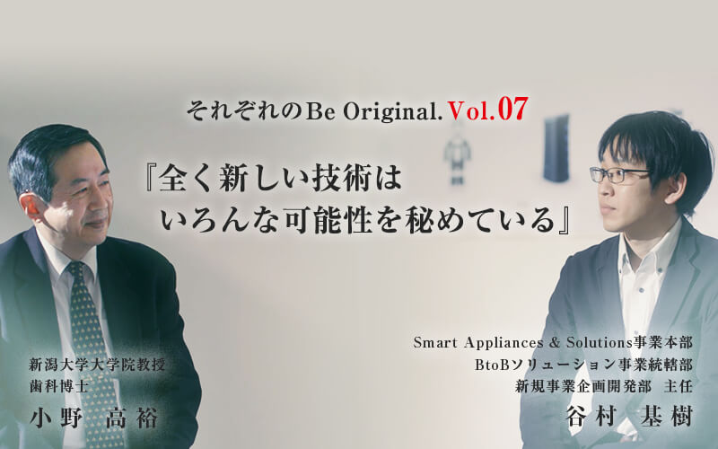 今回は、当シリーズ で初めて開発パートナーとの対談を行いました。開発パートナーは新潟大学大学院教授 歯科博士の小野高裕教授。「bitescan」の開発陣を代表して、当社Smart Appliances & Solutions事業本部 BtoBソリューション事業統轄部 新規事業企画開発部 技師の谷村基樹が、開発時の想いについて対談で語ります。