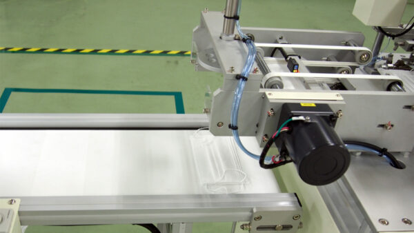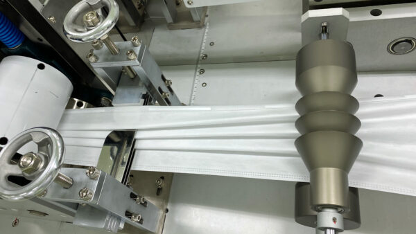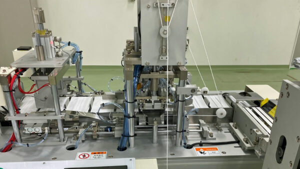 長方形に裁断された不織布(マスク)に左右の耳ひもが同時に取り付けられます。