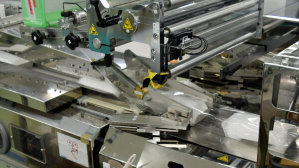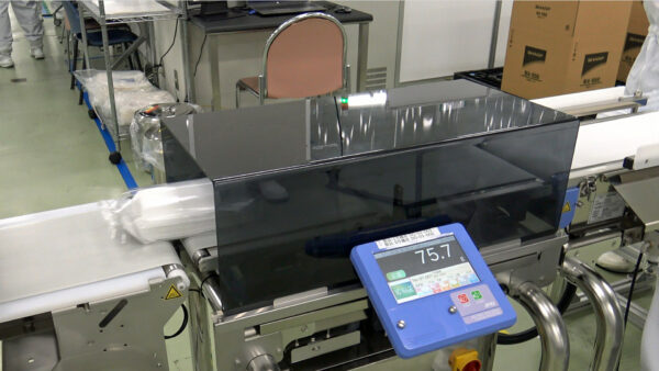 袋詰めされたマスクの枚数に間違いないか、異物が混入していないかなどを、センサーに通して最終チェックします。
