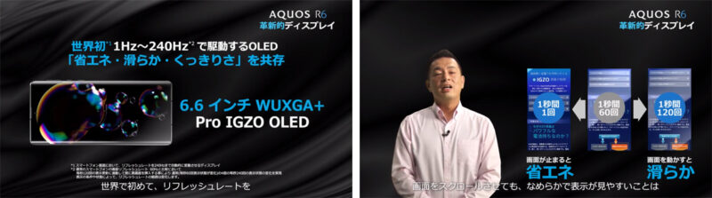 次に、前田より、バックブレーンのトランジスタにIGZO技術を使った有機ELディスプレイ「Pro IGZO OLED」について説明しました。IGZO液晶とOLEDのそれぞれいいところを融合し、6.6インチWUXGA+、Pro IGZO OLEDは世界で初めてリフレッシュレート1Hz-240Hzまで変化させながら駆動し、「省エネ・滑らか・くっきりさ」の表示を同時に実現しています。