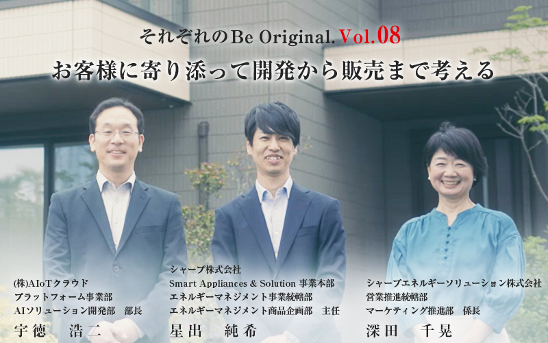 今回は、『クラウドHEMSサービス COCORO ENERGY』の関係者を代表して、Smart Appliances & Solution事業本部 エネルギーマネジメント事業統轄部 エネルギーマネジメント商品企画部 課長の星出 純希と、株式会社AIoTクラウド プラットフォーム事業部 AIソリューション開発部 部長の宇徳 浩二、シャープエネルギーソリューション株式会社 営業推進統轄部 マーケティング推進部 係長の深田 千晃の3名が、開発時の想いについて語ります。