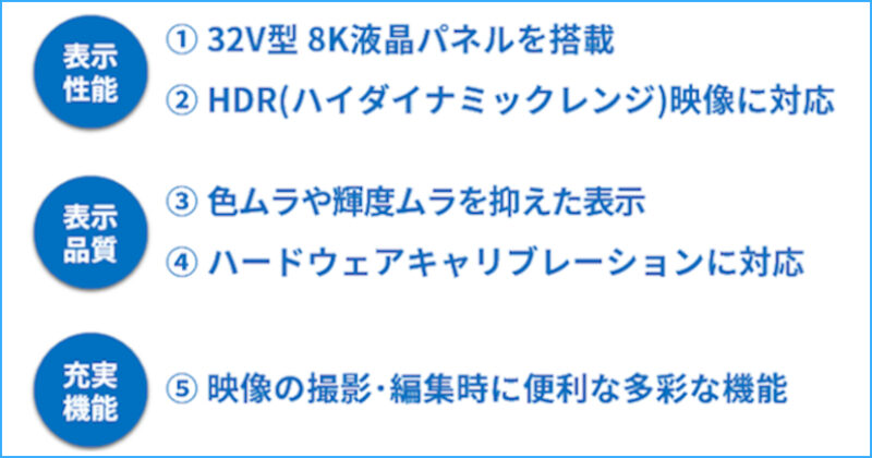 今、8Kカメラで撮影したHDR映像や画像を、撮影現場や編集場所で、HDRで見ながら編集するための8Kカラーマネジメントディスプレイが必要になってきているわけです。単なるディスプレイではなく、映像や画像を扱うプロやハイアマチュア向けの製品となるため、要求仕様も高く、高品質のものが求められているのです。