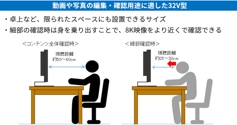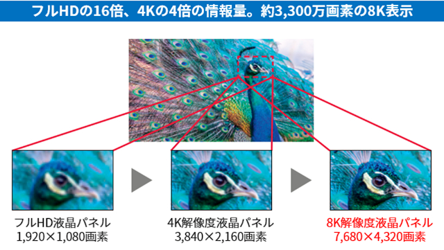 (福富)8K解像度の液晶パネルは、フルHDパネルの16倍、4Kパネルの4倍の約3,300万画素を表示します。32V型で画面に近づいて見た場合、人間の目で識別できる限界がほぼ8K解像度になります。