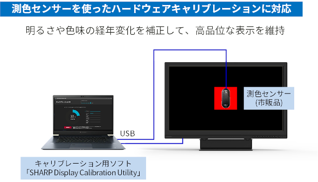 ディスプレイは使っているとどうしても経年変化で、画面の明るさや色味が変化してしまいます。これを補正するために、本製品は市販の測色センサーを使ったハードウェアキャリブレーション(調整)に対応し、高品位な表示を維持できる機能を搭載しています。