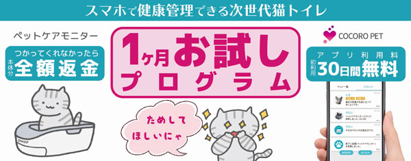 猫ちゃんが使ってくれなかったら本体分のご購入代金を全額返金いたします。さらに、初めてご利用の方は最初の30日間、アプリの利用料が無料になります!昨秋、期間限定で全額返金のキャンペーンを実施したところ、たくさんの方にご利用いただきました。猫ちゃんのためを思って買ったトイレなのに、猫ちゃんが使ってくれなかったら悲しいですよね。そういった飼い主さんの不安な気持ちを少しでも軽くし、ペットケアモニターを気軽に使ってみていただきたい。そうした思いから、これからは期間限定ではなく、いつでもご利用可能なプログラムとして提供することになりました。