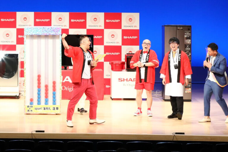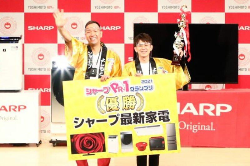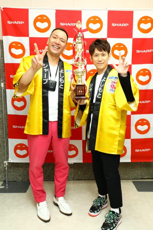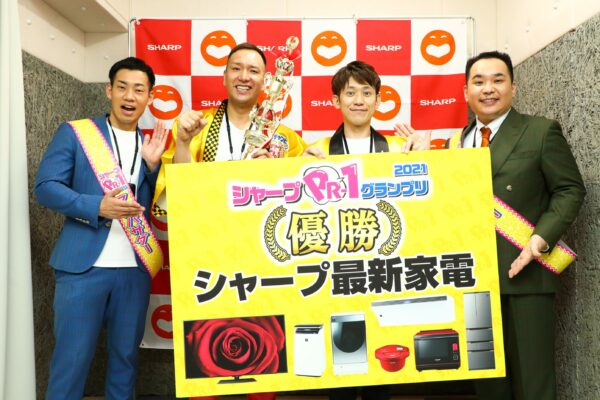 優勝したspan!さんには、金の法被と当社の製品をそれぞれお一人ひとつずつ、そしてミルクボーイさんと一緒に当社の営業に出演できる権利と、そのギャラがいつもより大幅アップするという賞品が贈られました!水本さんは、新婚ということでテレビを、マコトさんはちょうど壊れたという冷蔵庫を選ばれました。おめでとうございます!