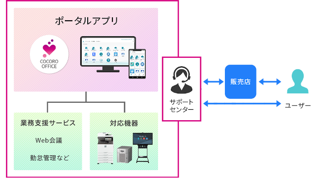 COCORO OFFICEとはテレワークやWeb会議、社内のデータ管理などに必要な機器・サービスの導入から運用までをワンストップでサポートし、業務の刷新、効率化を支援する、スマートオフィスサービスです。