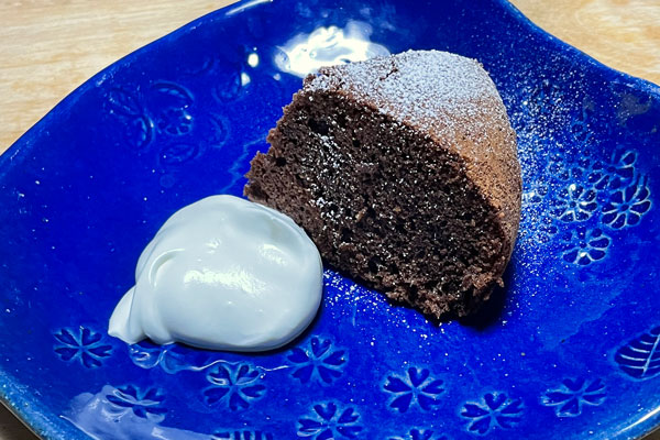 できあがりは少しゆるめかな?という感じですが、時間を延長してさらに泡立てるか、ヘラで混ぜるうちに固くなってくるので、用途に合わせて固さを調節してくださいね。今日はホットクックで焼いたガトーショコラにホイップクリームを添えてみました。