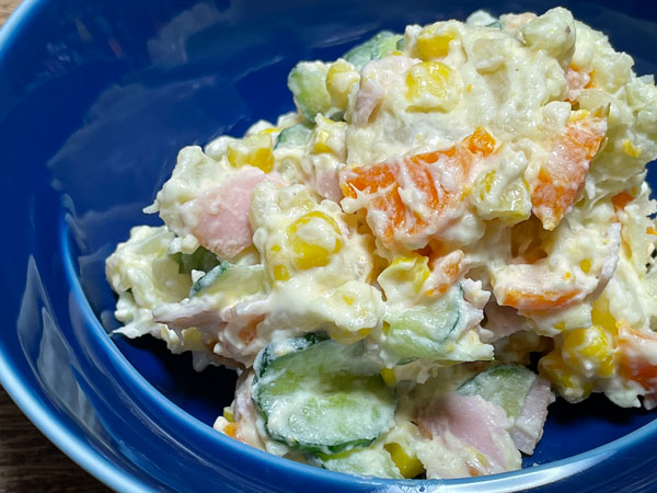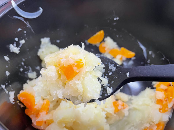 加熱後はこんなになめらかな仕上がり。そして食材の水分を活用・循環させるホットクックなので、じゃがいもの旨味や甘みが凝縮されています。食べた人からは「なにこれ、めっちゃおいしい!なにか特別な調味料使っているの?」と聞かれました。普通のマヨネーズ+塩こしょうだけなのに、ワンランク上のポテトサラダが作れます。