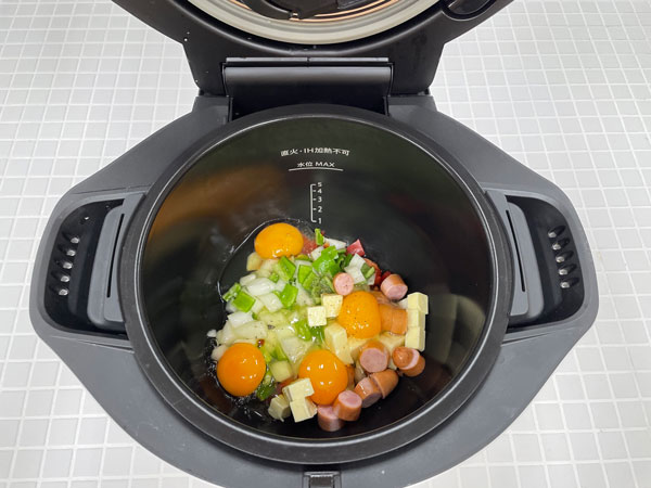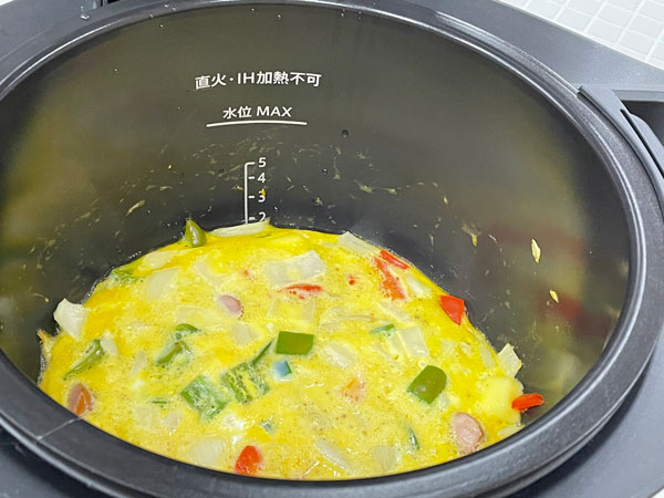 そしてオープンオムレツ。こちらも卵を混ぜる手間がいりません。切った野菜とウインナー、チーズ、卵などをポンポンポンと内鍋に入れて、あとは調理を開始するだけ。卵を混ぜるのって地味に面倒なんですよね・・そして何より卵を混ぜるボウルなどの洗い物が増えないのが嬉しいです。