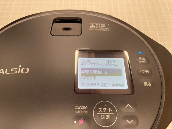 まずは内鍋を冷蔵庫で冷やしておきます。そして、直前まで冷やしておいた生クリームと砂糖を内鍋に入れて、スタート!