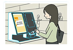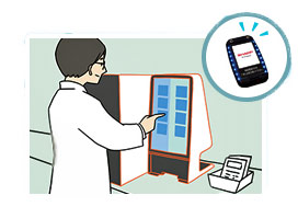 受付で、「非対面 コールベル・受付システム」のお客様側の画面から来訪目的を選択し、タッチすると、コールベルが出てきます。お客様はそのコールベルを受け取り、呼び出されるのを待つシステムです。受付スタッフがお客様を呼び出す際には、「非対面 コールベル・受付システム」のスタッフ側の画面を操作するだけ。コールベルがお客様に順番が来たことを知らせます。