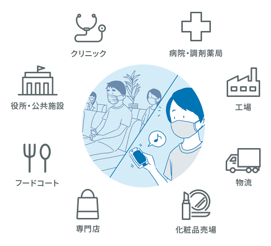 シャープはそうした不安の解消に向けて、フードコートなどでの利用がすすむコールベル(呼び出しベル)を活用した「非対面 コールベル・受付システム」を開発しました。このシステムを導入することで、お客様は、ソーシャルディスタンスを保つことが求められる様々な場所で、安心して受付を行えます。また、導入した法人にとっても受付スタッフの業務効率化が実現します。