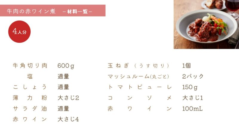 今回、中でもクリスマスにピッタリな「牛肉の赤ワイン煮」をチョイスし、ウェビナーのホスト を務めた大嶋が実際に作ってみました!